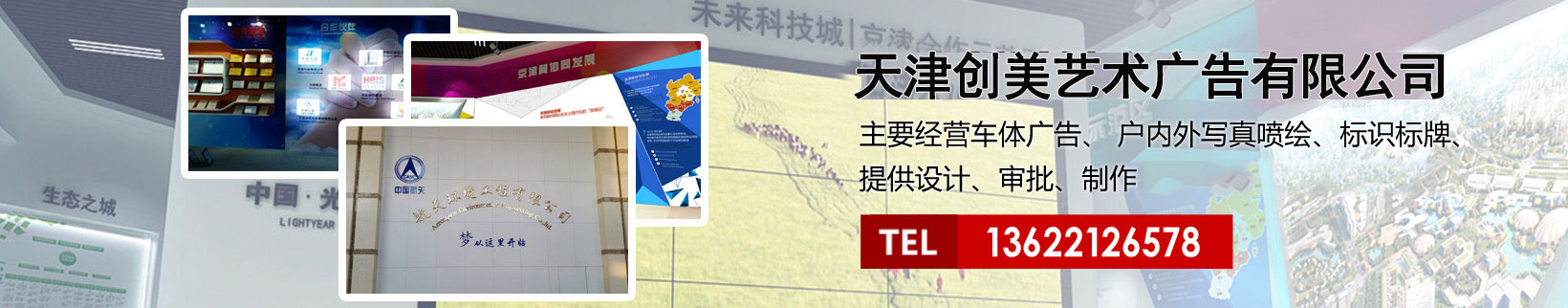 天津創(chuàng)美藝術廣告有限公司主要經營車體廣告、 戶內外寫真噴繪、標識標牌、提供設計、審批、制作、發(fā)布的服務。